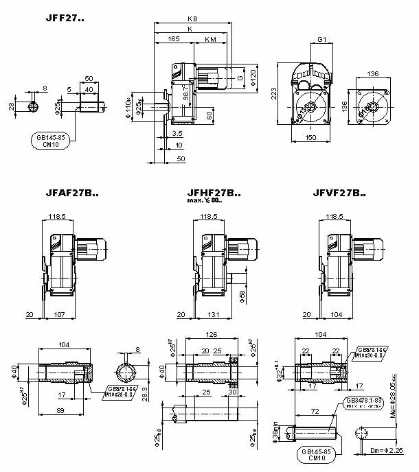 | 當(dāng)前位置:減速機(jī)首頁 >> 產(chǎn)品大全 >> 減速電機(jī) >> JF系列減速電機(jī)(GB10095-88) >> JF系列減速機(jī)外形安裝尺寸(JF27、JFA27B、JFH27B、JFV27B、JFF27、JFAF27B、JFHF27B、JFVF27B、JF..27/G、JFA27、JFH27、JFV27、JFAZ27、JFHZ27、JFVZ27)(GB10095-88) |