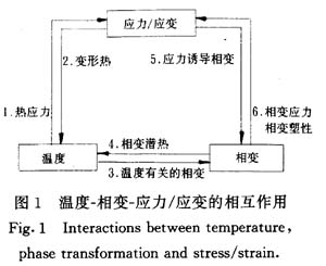 鋼在淬火過(guò)程中存在極為復(fù)雜的溫度、相變、應(yīng)力/應(yīng)變相互作用,在此方面已有許多報(bào)道[1]。如圖1所示,在淬火過(guò)程中,溫度造成熱應(yīng)力并影響材料的力學(xué)參數(shù)(彈性模量、泊松比、屈服強(qiáng)度和應(yīng)變硬化率等),從而影響材料的力學(xué)行為。應(yīng)力/應(yīng)變則以變形熱的形式反過(guò)來(lái)影響溫度的變化。隨著溫度的降低,在達(dá)到相變條件后將發(fā)生相變。溫度是決定相變的因素之一,但其本身又受著相變潛熱的影響。內(nèi)應(yīng)力的存在,可通過(guò)一種通常稱(chēng)為應(yīng)力誘導(dǎo)相變的機(jī)制而影響相變的進(jìn)程。在相變過(guò)程中,各組成相的比容差異將造成相變應(yīng)力,同時(shí)由于材料的絕大多數(shù)參數(shù)除了依賴(lài)于溫度實(shí)際上也依賴(lài)于相態(tài),因此,相變也會(huì)對(duì)材料的力學(xué)行為產(chǎn)生影響。此外,在有內(nèi)應(yīng)力存在時(shí)相變過(guò)程中還會(huì)伴隨一種“反!钡乃苄孕袨,即材料在應(yīng)力低于屈服強(qiáng)度的情況下就可以發(fā)生不可逆變形的現(xiàn)象,稱(chēng)為相變塑性。