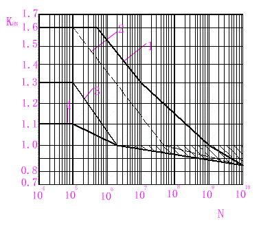 圖1 彎曲疲勞壽命系數(shù)KFN(當(dāng)N>Nc時(shí),可根據(jù)經(jīng)驗(yàn)在網(wǎng)紋區(qū)內(nèi)取KFN值)