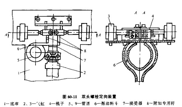 圖60-11中雙頭螺栓從振動(dòng)料斗6沿管道9前進(jìn)。在此雙頭螺栓之前,另有一個(gè)雙頭螺栓從振動(dòng)料斗進(jìn)入氣缸2推動(dòng)的供料接受器7,前一螺栓被后一螺栓的桿身或由接受器7的附加轉(zhuǎn)用桿隔離。移動(dòng)的雙頭螺栓由兩個(gè)彈簧作用的梳子供料。氣缸2在前面位置停下來后,氣缸3接通,將梳子4向兩個(gè)不同方向分開。一對梳子均帶有齒頂不尖的雙頭螺栓,其中一個(gè)梳子處于同雙有螺栓的螺紋嚙和狀態(tài),另一個(gè)梳子沿著螺距較小的螺紋梳子面滑動(dòng)。移動(dòng)時(shí),雙頭螺栓將滑入底座1的橢圓窗孔并沿著接受槽(即管道5)進(jìn)入螺栓搬運(yùn)器,在進(jìn)入旋緊螺栓的工作機(jī)構(gòu)。第二個(gè)梳子由于螺距不同,不能與雙頭螺栓端部螺紋嚙合,因而停留在螺紋表面上。作為例外(當(dāng)螺栓直徑和質(zhì)量較大時(shí)),梳子螺紋和螺栓螺紋相同,但可能與螺栓不重合。但當(dāng)油缸活塞桿開始運(yùn)動(dòng)時(shí),梳子就一定能與螺栓螺紋想嚙合。當(dāng)螺栓進(jìn)入梳子面下時(shí),雙頭螺栓在梳子牙條傾斜角作用下轉(zhuǎn)動(dòng),因此牙條與雙頭螺栓相嚙合始終不少于三個(gè)牙;而另一雙頭螺栓不進(jìn)行嚙合。