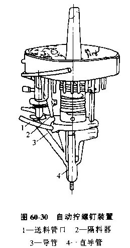(1)導管式螺釘自動裝配工作頭,這種工作頭通過導管來引導已定向的螺釘按正確的姿態(tài)進入裝配位置。圖60-30為一種擰緊器與供料裝置為一體的自動擰緊螺釘裝置。螺釘在送料管口1處被隔料器2擋住,主軸帶動改錐將螺釘擰入工件后,該錐上抬,隔料器2放下一個螺釘使之沿導管3進入直導管4,進入新的循環(huán)。