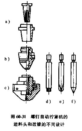進料頭需要根據(jù)螺釘尺寸和螺釘裝配要求設(shè)計。圖60-31為幾種不同類型的進料頭和旋具。圖60-31a中的進料頭適用于長徑比大于5的螺釘,進料頭帶有一個錐形彈性鉗,內(nèi)錐通過主軸上的套筒實現(xiàn)定心。圖60-31b和圖60-31c適用于短螺釘,這兩種進料頭別有鉸鏈式鉗臂裝在軸上,關(guān)閉時形成一個螺釘直徑大小的孔,進料時進料頭與孔的上端接觸,在擰人螺釘?shù)倪^程中,鉸鏈臂通過旋具的設(shè)計可根據(jù)螺釘頭取相應(yīng)的結(jié)構(gòu),如六角形、十字形成或帶槽的旋具。