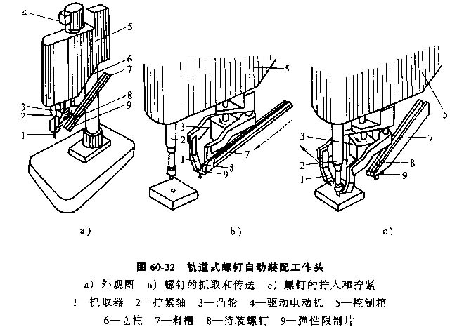 2)軌道式螺紋自動裝配工作頭,這種工作頭的待裝螺釘在軌道中運(yùn)動。圖60-32為一種能實現(xiàn)螺釘自動傳送、抓取、對準(zhǔn)、擰入和擰緊等一系列作業(yè)的工作頭。工作頭的工作過程為: