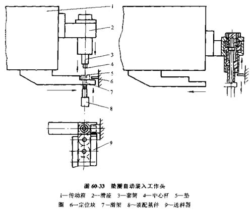圖60-33為一種墊圈自動裝入工作頭。墊圈5作為裝配由送料器9水平送入,呀靠滑架7和中心桿4定位。隨后滑座2下行,中心桿4插入墊圈孔內(nèi)。同時,裝配基準(zhǔn)件8上升與中心桿4結(jié)合;7隨即退回。然后套筒3下行,用機(jī)動推入方式完成墊圈5與裝配基準(zhǔn)件8的自動裝配作業(yè)。