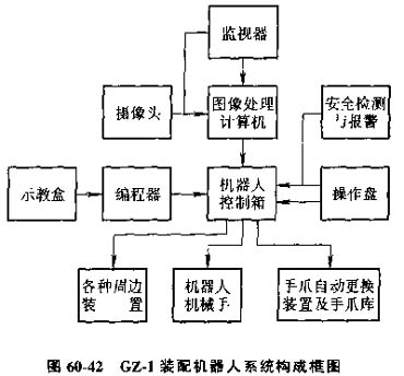 我國研制CZ-1型高速精度智能裝配機(jī)器人是一種可帶視覺的SCARA型機(jī)器人,具有由直流伺服電動(dòng)機(jī)驅(qū)動(dòng)的四個(gè)自由度。其基本結(jié)構(gòu)框見圖60-42。各部分的功能為: