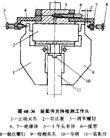 2) 裝配件夾持檢測(cè)工作頭,圖30-36所示工作頭根據(jù)夾持動(dòng)作發(fā)出的信號(hào),壓縮空氣進(jìn)入接管6,推動(dòng)雙活塞2,使止動(dòng)夾爪1及檢測(cè)夾爪9閉合,開(kāi)始夾持裝配件11。正常夾持時(shí)在夾爪9與觸點(diǎn)螺釘8之間形成間隙δ,兩者之間斷路。夾持失誤時(shí)間隙消失,夾爪9與螺釘8之間形成通路,通過(guò)控制回路發(fā)出報(bào)警信號(hào)。