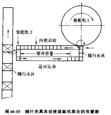 圖60-55所示為一臺回轉(zhuǎn)式裝配機與儀態(tài)直進式裝配機的組合布置;剞D(zhuǎn)裝配機I上已裝配的組件先送到a位置的隨行夾具上。由氣動裝置將組件從a位置腿到輸送機輸送帶上送到b位置。傳誦帶的長度決定緩沖區(qū)的容量。直進式裝配機Ⅱ上的處理裝置將組件從b位置放到裝配機Ⅱ的隨行夾具中、氣動裝置將空隨行夾具推倒輸送系統(tǒng)的返回輸送帶上,回到a位置。