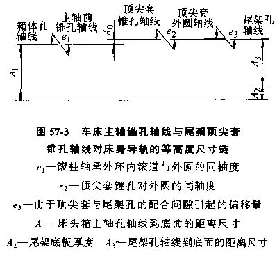 如果仔細查找,可以得到如圖57-2所示的以前、后頂尖高度差為封閉環(huán)的裝配尺寸連,相關(guān)零件有圖中的床頭箱、軸承、箱體、尾座頂尖套,尾座、尾座底板及圖中未示出的前、后頂尖和床身等。