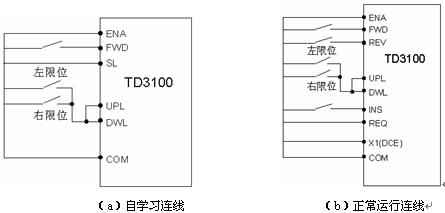 自學(xué)習(xí)連接線路如圖2(a)所示。將UPL和DWL短接,左限位與右限位并聯(lián),當(dāng)作平層信號輸入到UPL、DWL,自學(xué)習(xí)開始的位置應(yīng)該從左端或者右端的限位外的位置開始,如果不能夠離開限位的位置,可以先自學(xué)習(xí)后,在正常運行時通過調(diào)整平層距離調(diào)整F4.07或者層高1 F4.09來保證位置精度。設(shè)定F4.00為2,F4.01根據(jù)位置寬度來設(shè)定,用于自動計算分頻系數(shù)。自學(xué)習(xí)時,將FWD、SL端子合上,即開始自學(xué)習(xí),注意在運行到限位開關(guān)動作后,去除FWD命令,學(xué)習(xí)完成。查看F4.08和F4.09的值,看看是否正確記錄。如果加減速時間太長或者過短,可以通過調(diào)整F3.11~F3.16來解決。