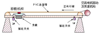 玻屏移載機的結(jié)構(gòu)如圖3所示,采用2.2kW電機驅(qū)動,電機額定電壓380V,額定工作頻率50HZ,額定電流5.0A,額定轉(zhuǎn)速1420r/m,減速比1:17,安裝有2個接近開關(guān),其中1#和2#接近開關(guān)之間距離大約1400~1800毫米,移載平臺帶負(fù)荷約150~170kg左右。移載機要求在兩個限位開關(guān)之間運動和定位,定位精度誤差要求3毫米以內(nèi),單行程移動完成時間大約2-3秒,即從1#限位開關(guān)加速到恒速,再到減速停止在2#限位點的時間要求在2-3秒內(nèi)完成。