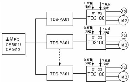該功能的典型應(yīng)用主要應(yīng)用在類似智能數(shù)字舞臺控制這樣的多電機多軸高精度距離控制系統(tǒng)中。采用PROFIBUS-DP現(xiàn)場總線控制的現(xiàn)代舞臺驅(qū)動系統(tǒng)如圖5所示。該系統(tǒng)采用PC機控制,內(nèi)置西門子插卡式PROFIBUS主站控制板CP5611或者CP5412均可,實現(xiàn)手動和自動控制。適配器采用EMERSON生產(chǎn)的PROFIBUS-DP適配器TDS-PA01與TD3100直接接口。采用PROFIBUS控制的目的是,由于舞臺控制電機較多,可以達(dá)到較高的實時控制精度和較快的響應(yīng)時間,達(dá)到既快又準(zhǔn)的目的。