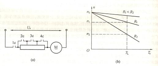 圖1(a) 改變電樞電阻調(diào)速電路 圖1(b) 改變電樞電阻調(diào)速時(shí)的機(jī)械特性