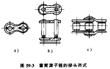 套筒滾字鏈的接頭形式見圖59-3所示。圖59a為用開口銷固定活動銷軸,圖59-3b為用彈簧卡片固定活動銷軸,這兩種方法都用于鏈條節(jié)數(shù)為偶數(shù)。用彈簧卡片時要注意使開口端方向與鏈條的速度方向像反,以防在運(yùn)轉(zhuǎn)中脫落。圖59-3c為采用過渡鏈節(jié)結(jié)合,用于鏈條節(jié)數(shù)為奇數(shù)。
