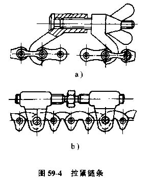 當(dāng)兩輪中心距離可調(diào)且鏈輪在軸端時,可以將鏈條兩端預(yù)先接好,再裝到鏈輪上,如果受結(jié)構(gòu)限制,只能先將鏈條套在鏈輪上再進(jìn)行連接,此時可以采用專用的拉緊工具,見圖59-4。