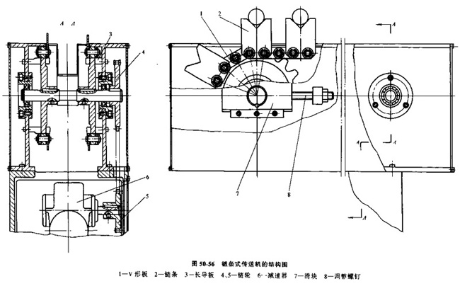 如圖50-56所式,它由兩列封閉式鏈條、鏈輪和驅(qū)動裝置所組成。用于支承工件及定位的V形板1,等距地固定在鏈條2的削軸上,隨同鏈條一起運動。鏈條由電動機通過減速器6和鏈輪5、4傳動,為了防止鏈條下垂,每個環(huán)節(jié)側(cè)面的滾子支承在導(dǎo)板3上,在減速器軸端裝有電磁離合器。用來實現(xiàn)鏈條的準確停止。鏈條的松緊可以通過螺釘8和滑塊7調(diào)節(jié)。
