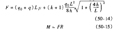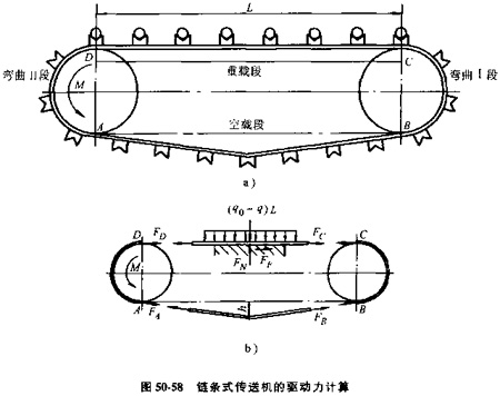 鏈條式傳誦機的驅(qū)動力F和驅(qū)動力距M,可參照鏈條運輸機的受力分析方法計算,見圖50-58。