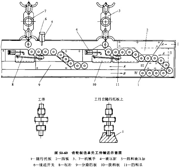 圖50-60是由鏈板履帶傳送機組成的齒輪加工單元,工件安裝在隨行托板中,在鏈板履帶上輸送,箭頭A表示工件傳送方向,工件從通道Ⅰ輸入,經(jīng)分路擋板2分成兩路。一路沿通道Ⅱ進入第一臺滾齒機貯料區(qū),另一路沿通道Ⅲ經(jīng)分路擋板9進入第二臺滾齒機貯料區(qū)。上料時,液壓缸4動作,通過杠桿機構(gòu)8使撥料板10及擋料爪11動作,撥料塊將工件撥至機械手3前,擋料爪則將通道Ⅱ繼續(xù)送來的工件擋住,加工好的工件由通道Ⅰ輸出。