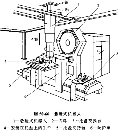 采用空架導軌的懸掛機器人,也屬于一種變化發(fā)展出的有軌小車,見圖50-66。在廠房內安裝了架在空中的導向導軌,懸掛式機器人可以由電動機拖動在導軌上行走,工件以及安裝工件托盤,可以由機器人的支持架托起,并可上下移動和旋轉。由于機器人可以自由地在x、y方向上移動,它就可以將工件連同托盤移動到導軌允許到達的任意位置上交換托盤和工件。