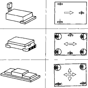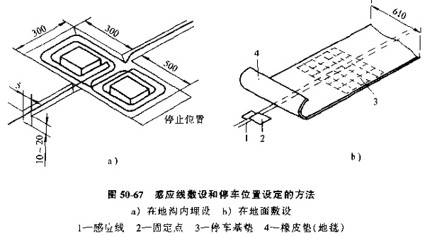 線導小車的導向方法是靠在地面敷設電磁感應導線來引導小車,感應線的敷設和停車位置的設定方法見圖50-67,過去因為感應線埋沒在地溝內,要改變小車的行駛路線仍然比較困難,現(xiàn)在已可以采用帶狀導線或磁線涂料直接在地面上敷設,所以大大增強了柔性制造系統(tǒng)布局的柔性,這種小車的緩沖自停精度較差。約為±30mm。若想達到較高的定位精度。需使用圓錐支點等機械定位裝置,使其定位精度可達±0.1mm。