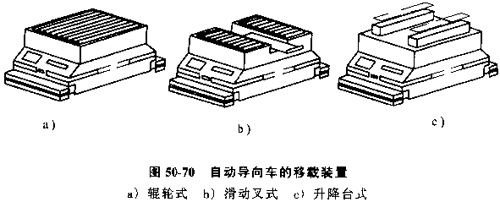 依載裝置。在小車的臺面上設置托盤或工件的傳送和接收裝置,以實現(xiàn)與機床或裝卸站之間的自動交換聯(lián)接,圖50-70所示是裝在小車臺面上的幾種移載裝置。