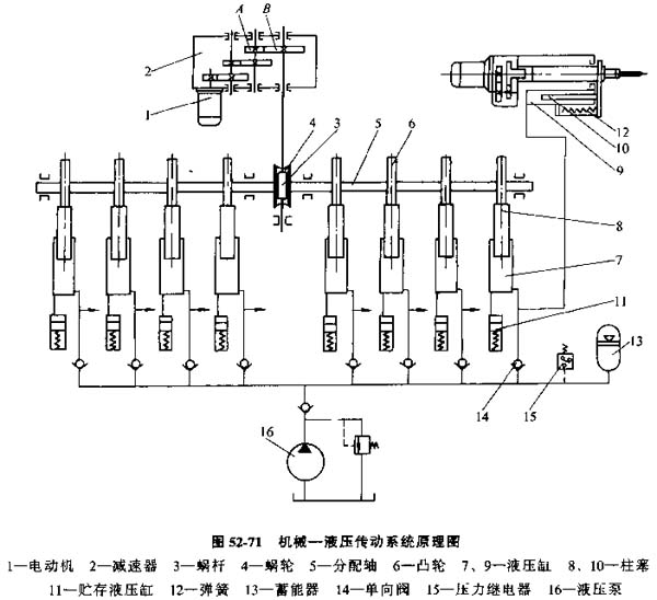 采用交流液壓傳動控制的一個小型自動線的工作原理見圖52-71。