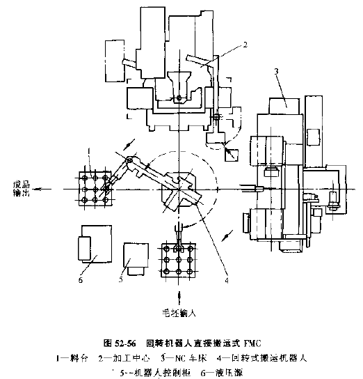 1) 回轉機器人直接搬運的FMC(見圖52-56)由1~4臺車削中心或其他數(shù)控機床,以及固定安裝的回轉式機器人和工件存貯臺等組成,各設備都布置在機器人周圍或兩側,工件在加工過程中的搬運都由機器人自動實現(xiàn)。