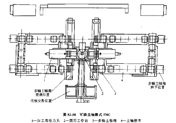 (3) 可換主軸箱式FMC,這種單元以多軸加工為主,適于品種不多的中、大批量的生產,加工設備是可更換主軸箱的組合機床,單元內設有主軸庫及其運輸交換裝置,圖52-58所示為可換箱式FMC。工件通過托板交換裝置,從、外部系統(tǒng)進入單元,送上圓形回轉工作臺夾緊,然后由兩側裝有相應主軸箱的動力頭驅動加工。
