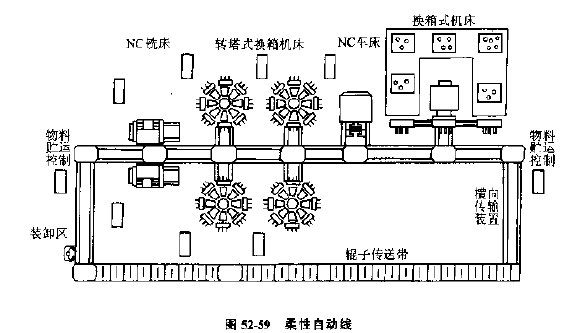 圖52-59所示為由雙面銑床和換箱組合加工中心組成的加工箱體零件的柔性自動(dòng)線示意圖。