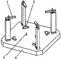 該工序的主要加工工藝是個軸承孔的鏜削加工,G、H及排擋側(cè)面的銑削加工及各面上聯(lián)接孔的鉆孔及攻絲。此工序的專用夾具(圖3)主要是由壓板1、墊板2、定位銷3、底板4構(gòu)成,校正后緊固在02工作臺上。具體使用方法是:工件加工好的C底板平放于02號工作臺專用夾具的墊板2上,并以夾具上兩個定位銷3為定位基準(zhǔn)插入工件上上道工序已加工好的2個F孔中,由于2個F孔的形位精度和尺寸精度較高,這樣就可以將工件精確定位在夾具上,同時用墊板2上的4個螺栓與其余4個孔配合,上緊螺母,為提高裝夾剛度,再用夾具上4個壓板1壓緊工件,這樣就將工件牢牢地固定在夾具上。調(diào)出相應(yīng)加工程序,執(zhí)行程序即可加工箱體工序2的各加工要素了。夾具再設(shè)計時嚴(yán)格確保了夾具中心、側(cè)面基準(zhǔn)與工作臺中心、側(cè)面基準(zhǔn)高度一致,這樣2個定位銷的中心就可以看作為工作臺的中心,通過采用2個定位銷精確定位,工件裝夾后,工件中心與工作臺中心基本重合,工件在加裝后就不需要進(jìn)行校正了,從而提高了工件的定位精度和加工效率。