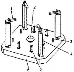 1.壓板 2.彈性定位銷 3.定位銷 4.彈性定位銷 5.調(diào)整螺栓 6.底板圖2 工序1專用夾具