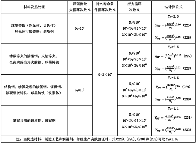 彎曲強(qiáng)度和壽命系數(shù)YNT應(yīng)根據(jù)實(shí)際齒輪實(shí)驗(yàn)或經(jīng)驗(yàn)統(tǒng)計(jì)數(shù)據(jù)得出的S-N曲線求得,它與材料、熱處理、載荷平穩(wěn)程度、輪齒尺寸及殘余應(yīng)力有關(guān)。當(dāng)直接采用S-N曲線確定和S-N曲線實(shí)驗(yàn)條件完全相同的齒輪壽命系數(shù)YNT時(shí),應(yīng)取系數(shù)YδrelT,YRrelT,Yx的值為1.0。