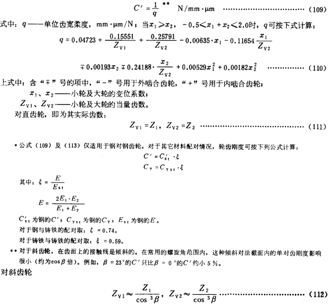 當(dāng)齒圈及輪輻很薄時(shí),C′可較剛性齒輪降低50%。在端面重合度εα>1.2時(shí),可近似取單對(duì)齒嚙合區(qū)上界點(diǎn)處的C′作為最大剛度,也可將公式(109)的計(jì)算結(jié)果約降低10%使用。