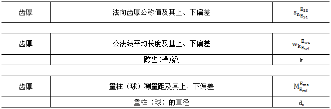 2.8齒厚:公稱值及其上、下偏差(法向齒厚公稱值及其上、下偏差,或公法線平均長度及其上、下偏差,或量柱(球)測量距及其上、下偏差)