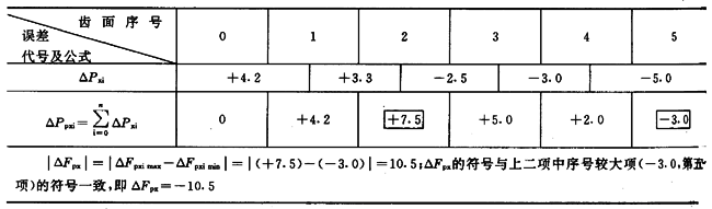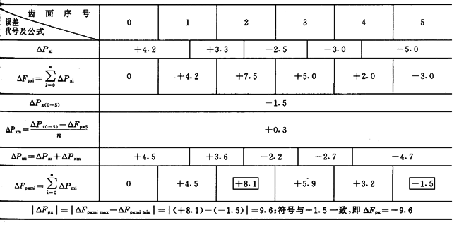 由指示表讀出的逐齒軸向齒距偏差ΔPxi經(jīng)計(jì)算得到ΔFPX(見(jiàn)表13)。