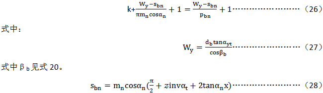 度量表面間所跨的齒數(shù)k應(yīng)這樣來(lái)選擇,即其接觸線大體上位于齒高的中間,可按下面方法來(lái)計(jì)算(圓整到最近的整數(shù)):