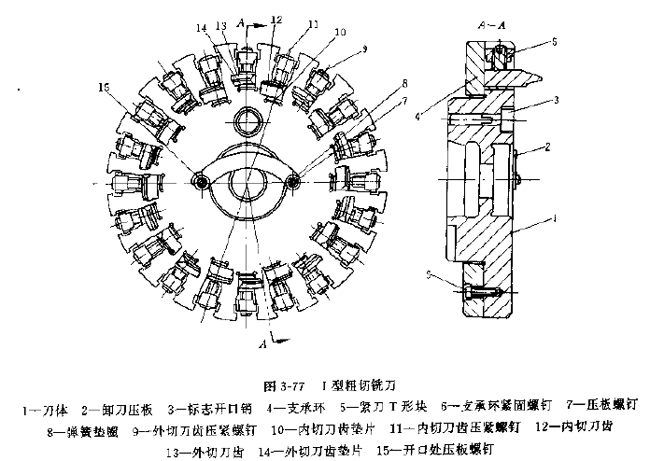 Ⅰ型雙面及三面粗切銑刀用于粗加工弧齒錐齒輪和準(zhǔn)雙曲面齒輪副中的大、小齒輪。該銑刀刀體硬度高、剛性好、刀齒采用T型塊夾緊,結(jié)構(gòu)緊湊,刀齒數(shù)量多,且裝卸靈活方便,銑刀有A、B兩中型式的錐孔直徑,A型孔適用于國產(chǎn)機床,B型孔適用于進(jìn)口格里森機床或新型仿制機床。銑刀公稱直徑有3.75,4.5,5,6,7,5,9,10.5,12,14,16,18in等十一種,其結(jié)構(gòu)型式和基本尺寸見圖3-77和表3-152~153。