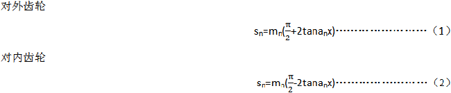 在分度圓柱上法向平面的“公稱齒厚sn”是指齒厚理論值,該齒輪與具有理論齒厚的相配齒輪在基本中心距之下無側(cè)隙嚙合。公稱齒厚可用下列公式計算。