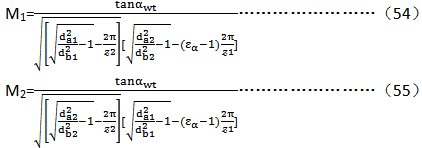 M1(用小輪單對齒內(nèi)界點(下界點)處ρrelB除以節(jié)點處ρrelC的商)與M2(用大輪的ρrelD除以ρrelC商)可由下述式子確定。