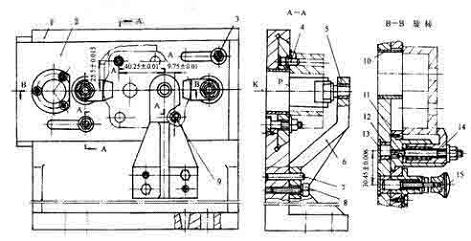 1.夾具體 2.移動分度塊 3.鎖緊螺母 4.圓柱定位銷 5、12.襯套 6.支承座 7.圓柱銷 8.螺釘 9.削邊定位銷 10.防屑套 11.騎縫銷 13.密封塊 14.鉤形壓板機構(gòu) 15.分度對定機構(gòu)