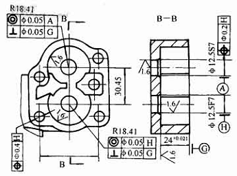 圖1為齒輪泵體加工兩孔的工序簡圖。從圖1可知:小孔12.5為7級,且兩孔極限尺寸不同;大孔R18.41接近8級;有同軸度、垂直度、位置度公差要求,特別是位置度公差很小。因此,孔的加工難度大。
