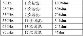 根據(jù)諧波分析,在變頻器電路中不含3次及3的整數(shù)倍諧波分量。在三相對(duì)稱系統(tǒng)中,3的整數(shù)倍諧波可自行消除,可以不考慮,亦無偶次諧波。其各次諧波峰值可達(dá)到的百分比如下表所示: