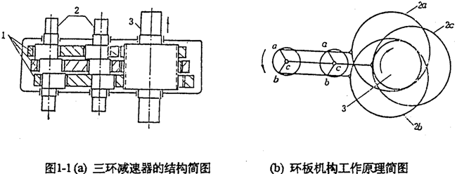 由于雙曲柄機(jī)構(gòu)在曲柄旋轉(zhuǎn)一周要經(jīng)過對稱的兩個“死點(diǎn)”位置,可以采用兩相(套)以上的并列雙曲柄機(jī)構(gòu)以克服“死點(diǎn)”的不確定性。如三環(huán)減速器(見圖1-1),它是由相位差互為120°的三套平行雙曲柄機(jī)構(gòu)組成的三相并列雙曲柄機(jī)構(gòu)。當(dāng)某一套雙曲柄機(jī)構(gòu)位于“死點(diǎn)”位置時,另兩套雙曲柄機(jī)構(gòu)通過支承高速軸傳遞扭矩推動其越過“死點(diǎn)”位置。這種結(jié)構(gòu)的缺點(diǎn)是軸向尺寸大,中間齒板安裝比較困難,必須采用偏心套形式。高速軸上的鍵槽分度精度要求高。另外,三片行星齒輪,運(yùn)轉(zhuǎn)過程中容易出現(xiàn)載荷分配不均的現(xiàn)象。采用這種原理克服“死點(diǎn)”的連桿行星齒輪傳動還有單齒環(huán)(見圖1-3)等減速器。
