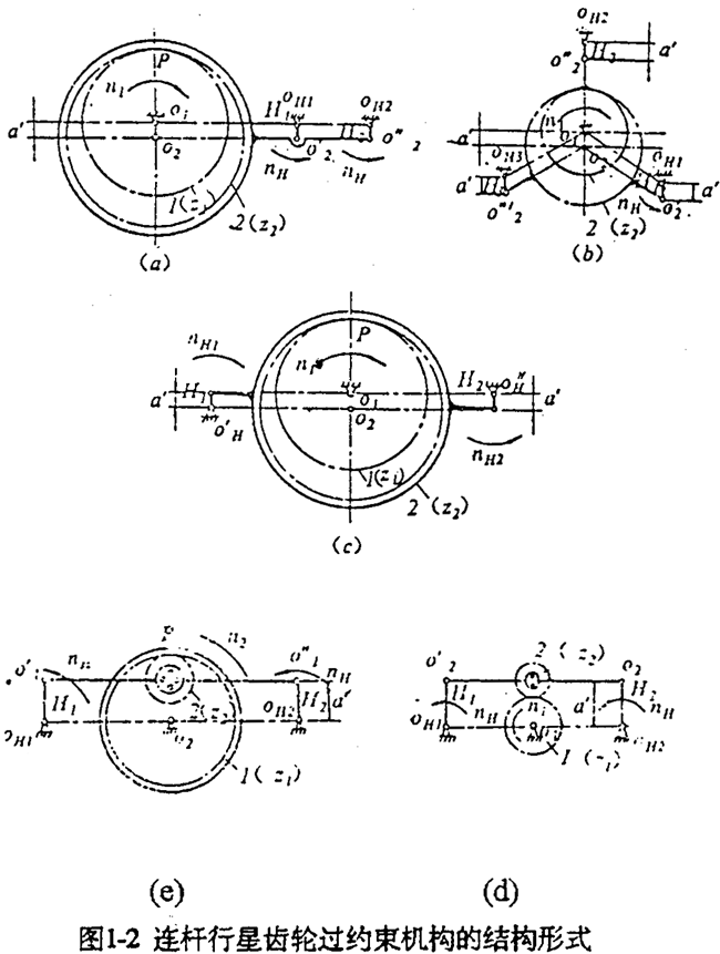 連桿行星齒輪傳動機(jī)構(gòu)還有如圖1-2所示的各種形式。圖1-1和圖1-2(a)、(b)、(d)、(e)均為平行四邊形機(jī)構(gòu),圖1-2(e)為反平行四邊形機(jī)構(gòu)。其中圖1-2(d)、(e)的連桿行星齒輪為外齒輪,其余均為內(nèi)齒輪。