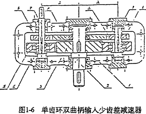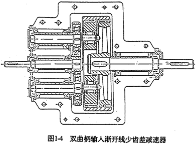 雙曲柄機(jī)構(gòu)中,如果在兩根曲軸上都有動力輸入,則“死點(diǎn)”位置也就自然不存在了。因此,可以通過一套定軸傳動機(jī)構(gòu)把動力從一輸入高速軸傳遞到另一高速軸,從而克服機(jī)構(gòu)“死點(diǎn)”。根據(jù)這種原理制成的雙曲柄輸入少齒差行星齒輪裝置之不理的類型很多,如太原工學(xué)院五十年代研制的雙曲柄輸入漸開線少齒差減速器(見圖1-4)、英國專利(見圖1-5)、、重慶鋼鐵公司研制的單齒環(huán)雙曲柄輸入少齒差減速器(見圖1-6)、日本松本和幸等人研制的RV減速器(見圖1-7)。其特點(diǎn)都是通過外嚙合齒輪副將輸入動力分流、傳遞到多個曲柄軸上,形式多軸輸入,從而克服“死點(diǎn)”。這種結(jié)構(gòu)的特點(diǎn)是其傳動比為定軸傳動的傳動比與少齒差行星齒輪傳動的傳動比之乘積,因而可以通過改變外嚙合齒輪的齒數(shù)方便函地滿足不同傳動比的要求,適應(yīng)性強(qiáng)。其不足之處是結(jié)構(gòu)復(fù)雜,而且在高速軸之間存在兩平行傳動的剛性傳動鏈(外齒輪嚙合副和雙曲柄機(jī)構(gòu))對誤差比較敏感,加工精度要求很高。