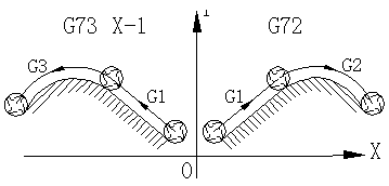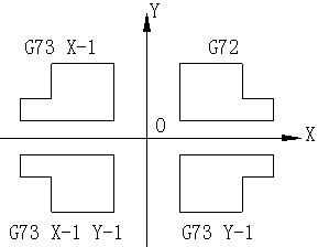 在數(shù)控加工程序代碼中,有個鏡像加工的指令。比如某型號加工中心的鏡像加工指令為G73(示意圖如圖1所示),其中設(shè)原加工圖形為第一象限的G72,使用G73 X-1指令后就可以加工出第二象限所示的圖形。也就是說將原程序段的加工代碼按Y軸或X軸(或XY混合)做軸向鏡像,當(dāng)要加工鏡像體時不需要另外編制程序,只需要將原程序代碼加以鏡像即可。