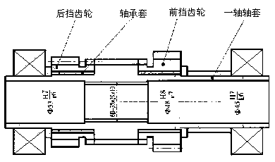 CPC2型叉車(chē)變速器,10%的產(chǎn)品在出廠試車(chē)時(shí)有異常響聲,不能順利過(guò)關(guān),經(jīng)檢查發(fā)現(xiàn)異常響聲從輸入軸總成(見(jiàn)圖1)中發(fā)出,并伴有齒輪與軸承套發(fā)生相對(duì)軸向位移和旋轉(zhuǎn)位移的現(xiàn)象。經(jīng)分析是一軸軸套內(nèi)花鍵大徑相對(duì)于軸套外圓徑向跳動(dòng)超差,導(dǎo)致軸承和前、后擋齒輪受擠壓所致。