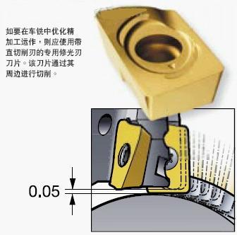 就粗加工工序而言,車銑不需要專用刀具;但若要優(yōu)化精加工工序,則應(yīng)使用專用的標(biāo)準(zhǔn)修光刃可轉(zhuǎn)位刀片。要使輕微的表面形狀偏差變圓滑,需要使用直的修光刃刀刃,而非用于一般銑削的常規(guī)弧形刀刃。在車銑運動中,切削點沿著生成表面的切削刃前后移動,而這意味著弧形刀刃可在直徑上造成更多的高度變化,從而加大扇形深度。