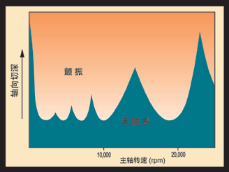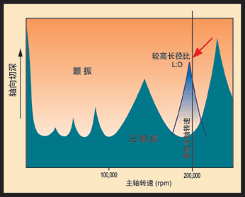 圖2 :該示意圖說明了由刀具、刀夾及高速主軸組成的特定系統(tǒng)中轉速和切深之間的關系。對于任何一個這樣的系統(tǒng),主軸轉速的上部分預計可以提供一個或多個""有效擊球點"",其中可以采用非常高的切深。
