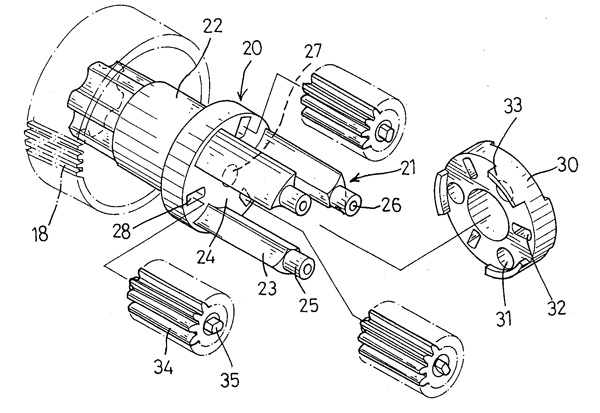 | 一種減速機(jī)自動導(dǎo)正機(jī)構(gòu),其是包括: 一本體,該本體一端形成為一開放端,且另端為封閉端,于該封閉端外周連設(shè)有一傳動齒輪,該本體的開放端端面上等分間隔有三個隔柱以及三個容置空間,且于三個隔柱朝開放端各凸設(shè)有一凸柱,該本體各于容置空間朝封閉端處凹設(shè)有一長槽; 三個容置于該容置空間的行星齒輪,該行星齒輪中央樞穿有一樞柱,而使該行星齒輪容置于該本體的容置空間內(nèi),且該樞柱的一端以容設(shè)于該本體的長槽內(nèi); 一封閉于該本體封閉端末端而呈環(huán)狀的封蓋,該封蓋于環(huán)面上設(shè)有三個穿孔,以供該本體的三個凸柱對應(yīng)貫穿該穿孔,且抵頂于該本體的三個隔柱頂面,而該封蓋對應(yīng)該行星齒輪的樞柱設(shè)有一長槽,使該等行星齒輪兩端凸出的樞柱各定位于封蓋及該本體的長槽間。 |