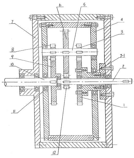 | 一種外齒式差動減速機,包括大箱體(7)、軸承(11)、支承在大箱體(7)上的輸入軸(2)和輸出軸(10),其特征在于: a、輸入軸(2)上固定連接有主動齒輪(12); b、輸出軸(10)的內(nèi)端固定有輸出齒輪(9); c、大箱體(7)內(nèi)具有可旋轉(zhuǎn)地支承在大箱體(7)和輸出軸(10)上的行星齒輪架(4),大箱體(7)內(nèi)還有與大箱體(7)固定連接的速比定齒輪(1); d、行星齒輪架(4)上支承有行星齒輪軸(5),該行星齒輪軸(5)上固定連接有與主動齒輪(12)嚙合的傳動齒輪(6)、與速比定齒輪(1)嚙合的第一行星齒輪(3)和與輸出齒輪(9)嚙合的第二行星齒輪(8)。 |